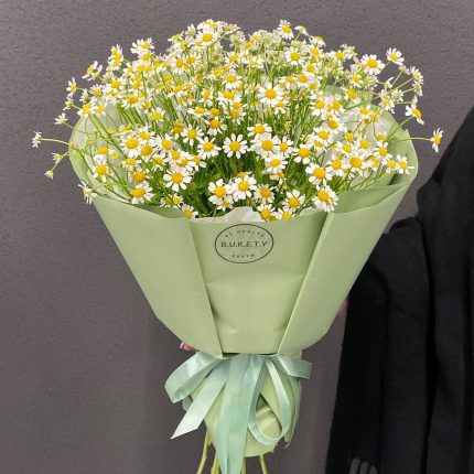 Букет из пионовидных кустовых роз и ромашек в оформлении!