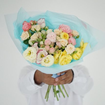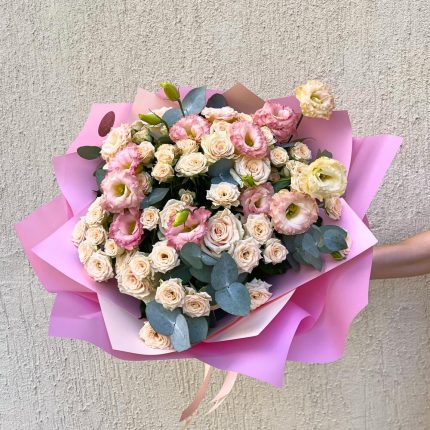 Представляем вам наш небольшой букет микс, который сочетает в себе нежную эустому и веточную розу. Этот букет – это нежный акцент к вашему дню, а бесплатная доставка по Тбилиси делает заказ особенно привлекательным.