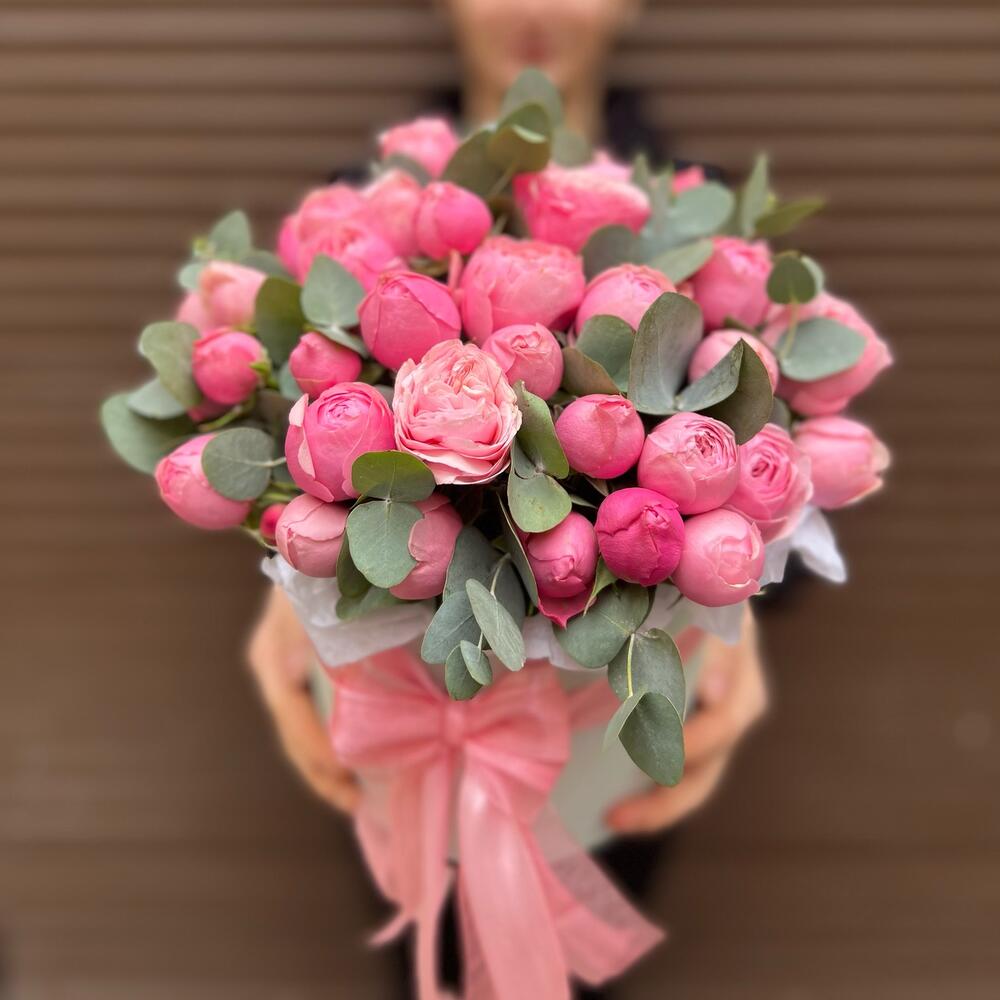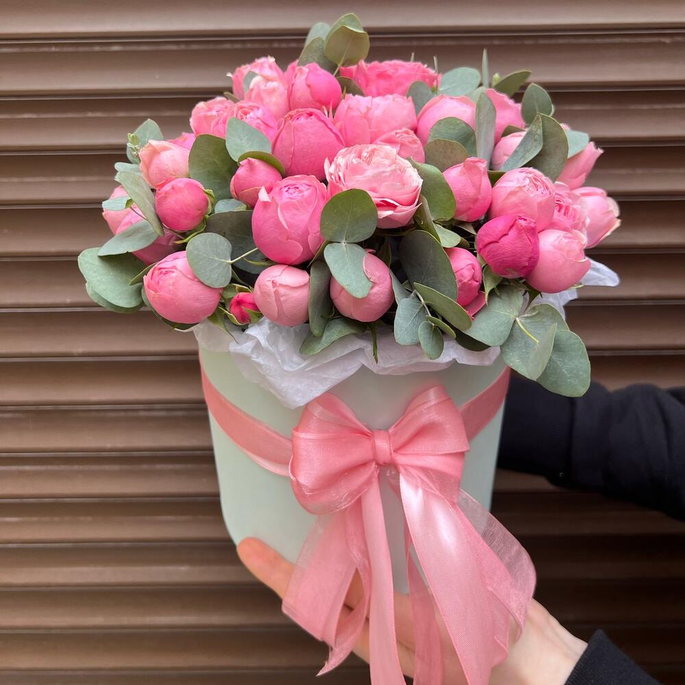 Эвкалипт – 10 шт.Лента атласная – 3 шт.Тишью – 1 шт.Коробка шляпная – 1 шт.Оазис флористический – 1 шт.сильвия пинк пионовидная кустовая роза – 11 шт.