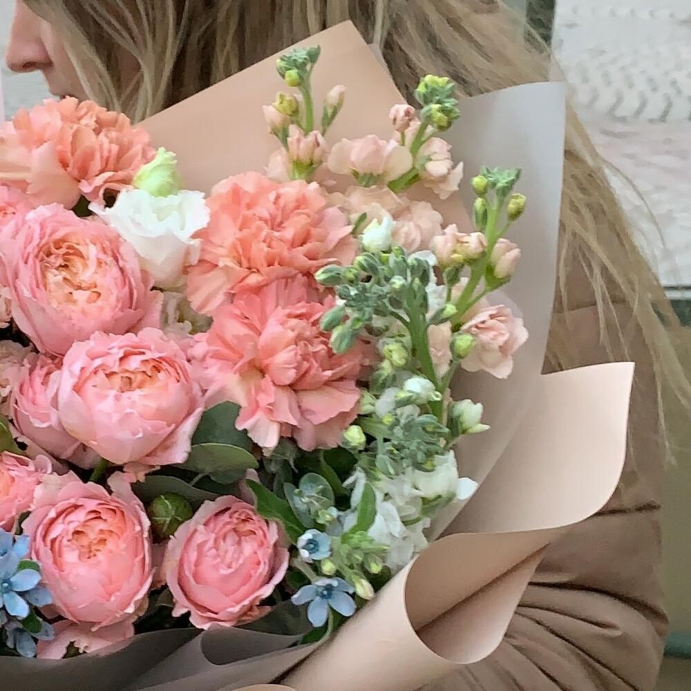 Букет пионовидных роз, маттиол и оксипеталума