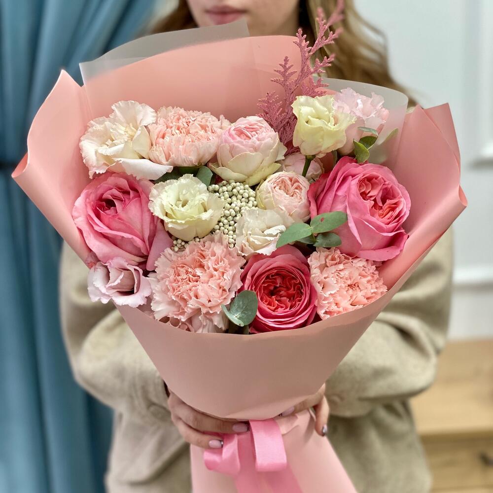 Озотамнус – 1 шт.Гвоздика сортовая – 3 шт.эустома розовая – 1 шт.Конифер – 1 шт.роза пионовидная пинк экспрешн – 3 шт.менсфилд парк кустовая пионовидная – 1 шт.эвкалипт 50 – 4 шт.
