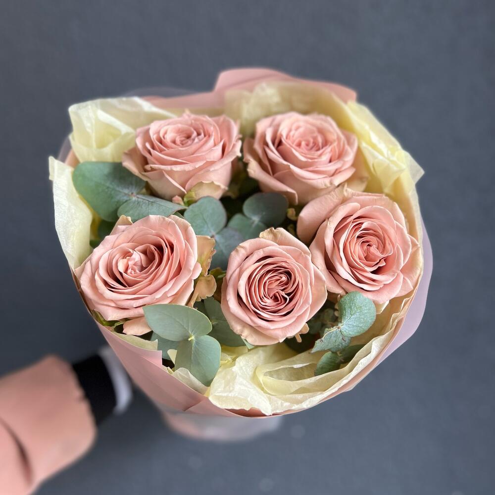 Эвкалипт – 2 шт.Лента атласная – 1 шт.Роза пионовидная – 5 шт.Дизайнерская упаковка – 1 шт.