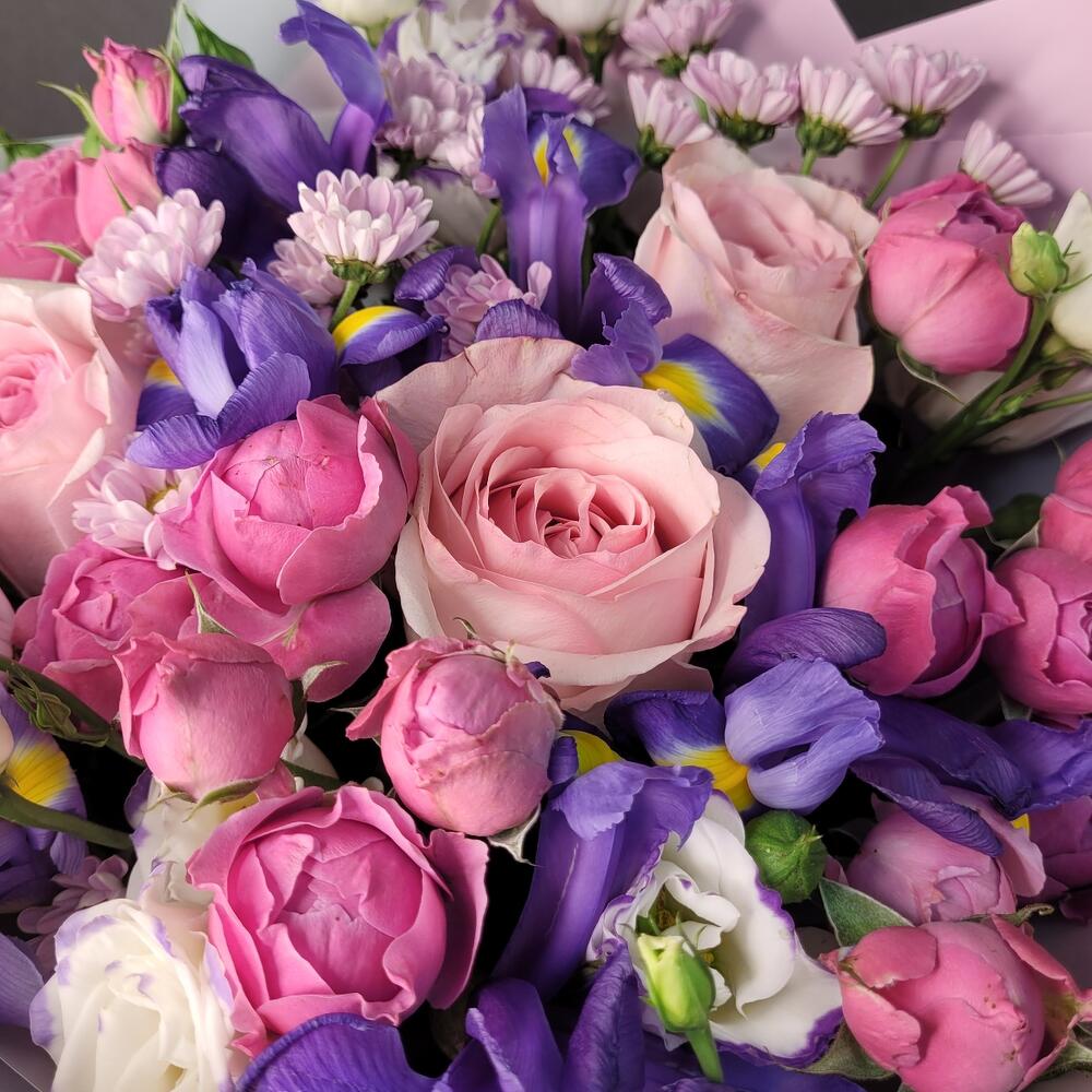 Букет роз, ирисов и сантини «Магнитизм»