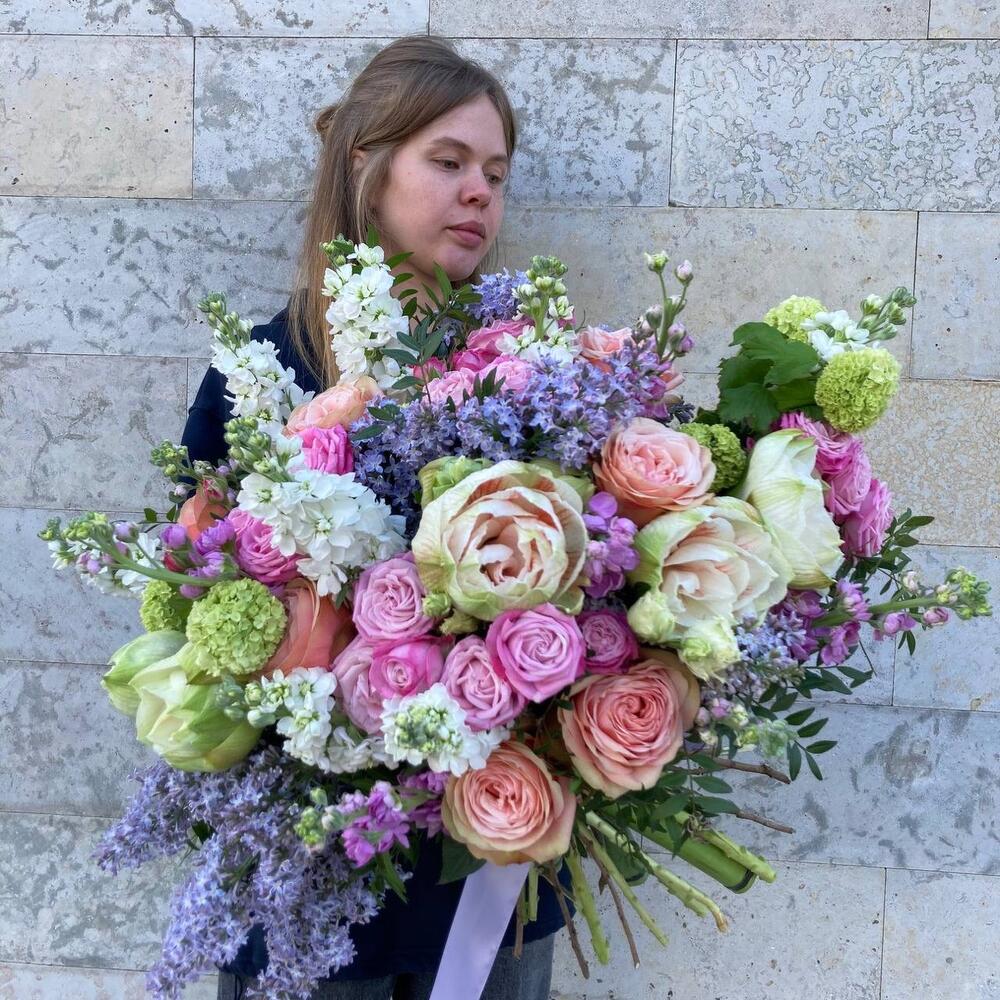амариллисы – 3 шт.Роза пионовидная – 13 шт.Маттиола – 15 шт.Сирень – 5 шт.Вибурнум – 3 шт.Лента – 1 шт.