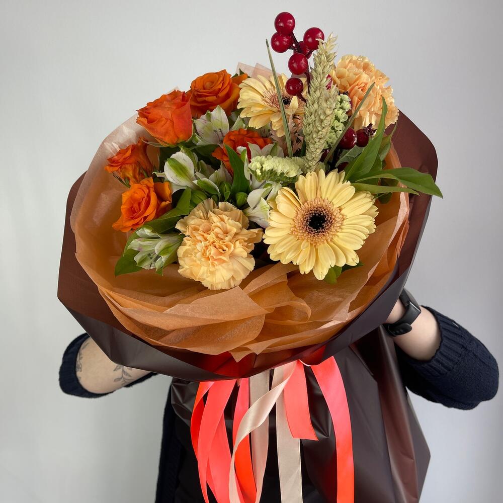 Гербера – 2 шт.Диантус – 2 шт.Роза – 5 шт.Альстромерия – 1 шт.Ягоды декоративные – 2 шт.Пшеница (сухоцвет) – 2 шт.Салал пучок – 1 шт.Упаковка дизайнерская – 2 шт.Лента атласная – 2 шт.