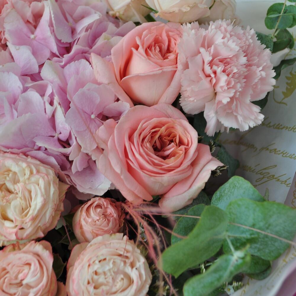 Гортензия – 1 шт.Лимониум – 1 шт.Эвкалипт – 1 шт.Гвоздика – 3 шт.Лента атласная – 1 шт.Роза пионовидная – 3 шт.Кустовая пионовидная роза – 2 шт.Крафт упаковка – 2 шт.Ковыль – 3 шт.Крафт жатый – 2 шт.