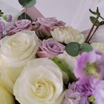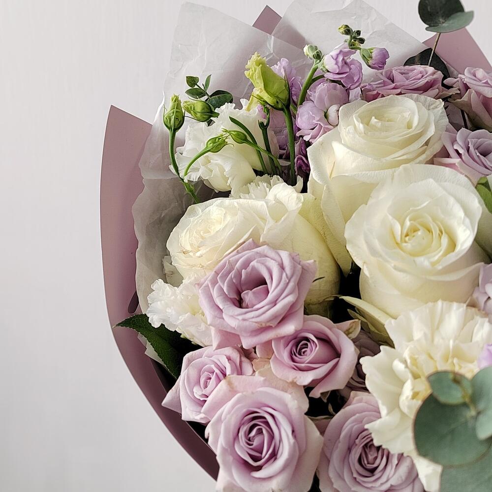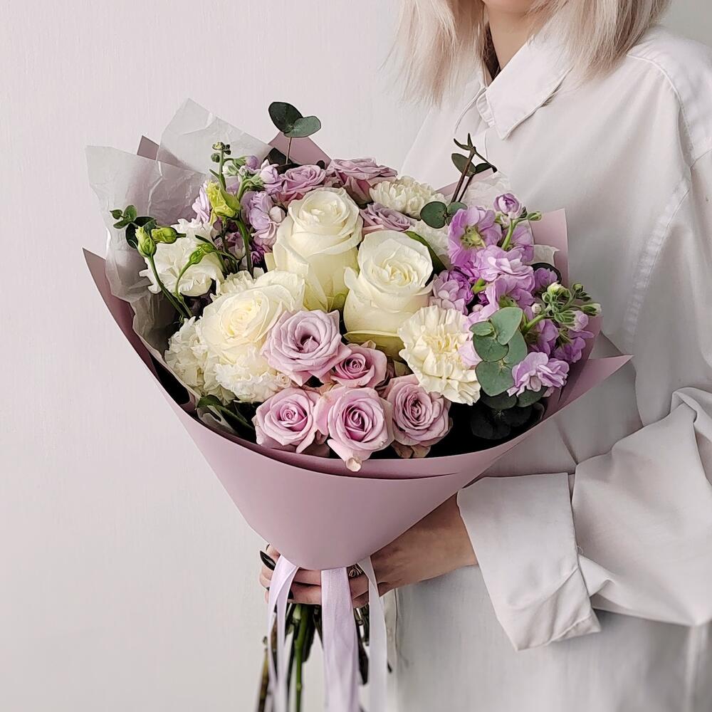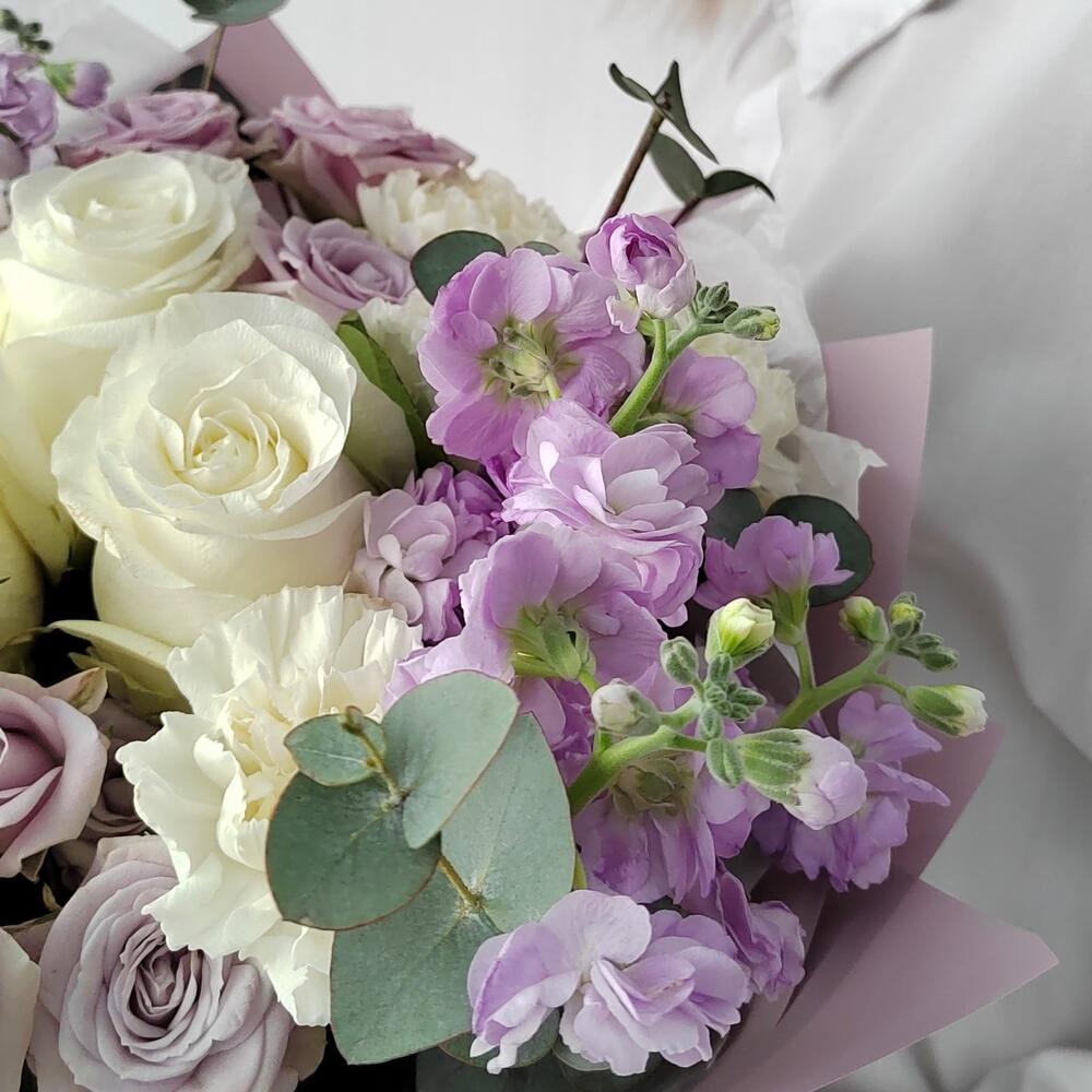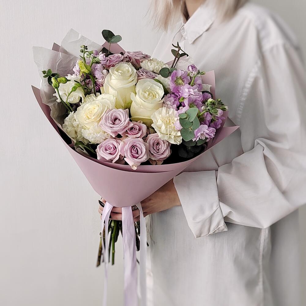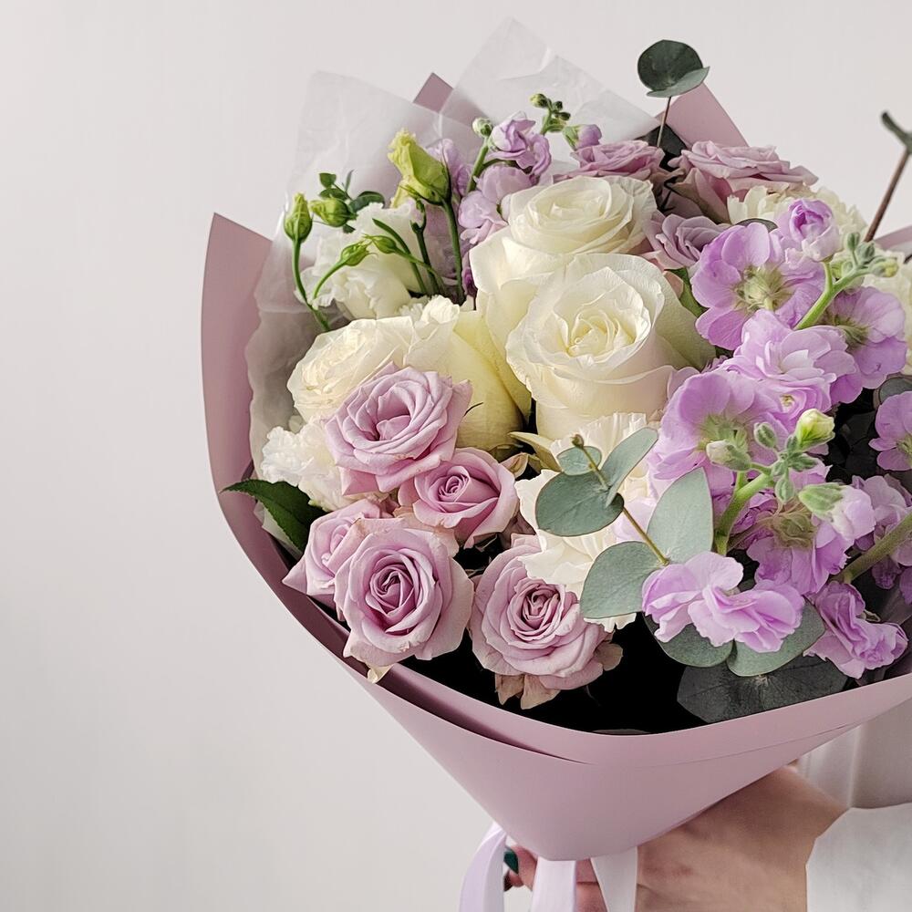 Маттиола – 2 шт.Эвкалипт – 3 шт.Роза одноголовая – 3 шт.Гвоздика – 3 шт.Эустома – 2 шт.Лента атласная – 4 шт.Упаковка дизайнерская – 4 шт.Салал пучок – 5 шт.роза кустовая лавандовая – 2 шт.