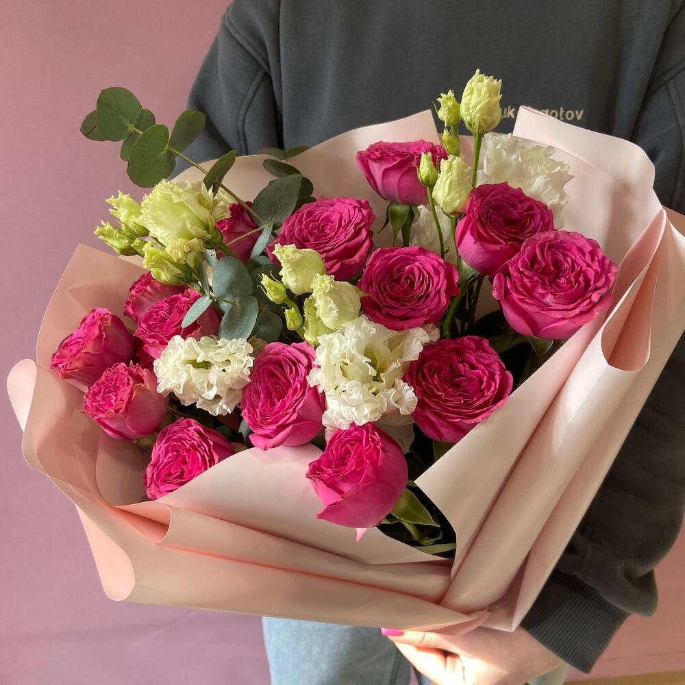 Роза кустовая пионовидная – 3 шт.Эустома – 2 шт.Корейская упаковка – 1 шт.Эвкалипт – 1 шт.бант атласный – 1 шт.