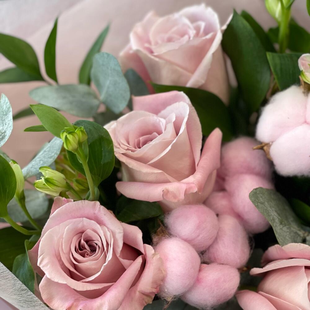 Альстромерия – 3 шт.Лента – 1 шт.Рускус – 5 шт.Хлопок – 4 шт.Эвкалипт – 2 шт.Роза одноголовая – 5 шт.бумага упаковочная – 1 шт.