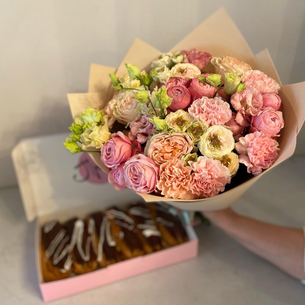 Букет с пионоаиднвми розами и эклеры