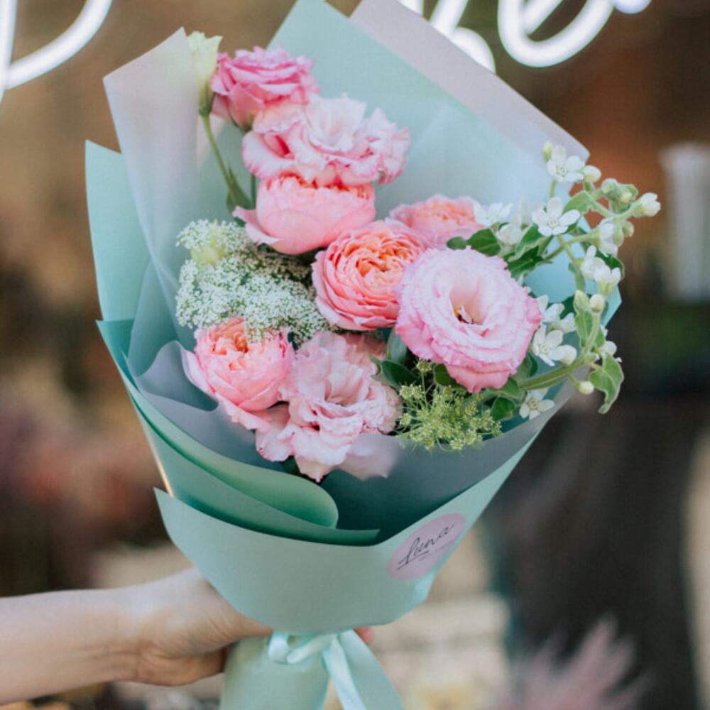 Пионовидная роза – 1 шт.Амми – 1 шт.Оксипеталум – 2 шт.Лизиантус – 3 шт.Упаковка – 1 шт.