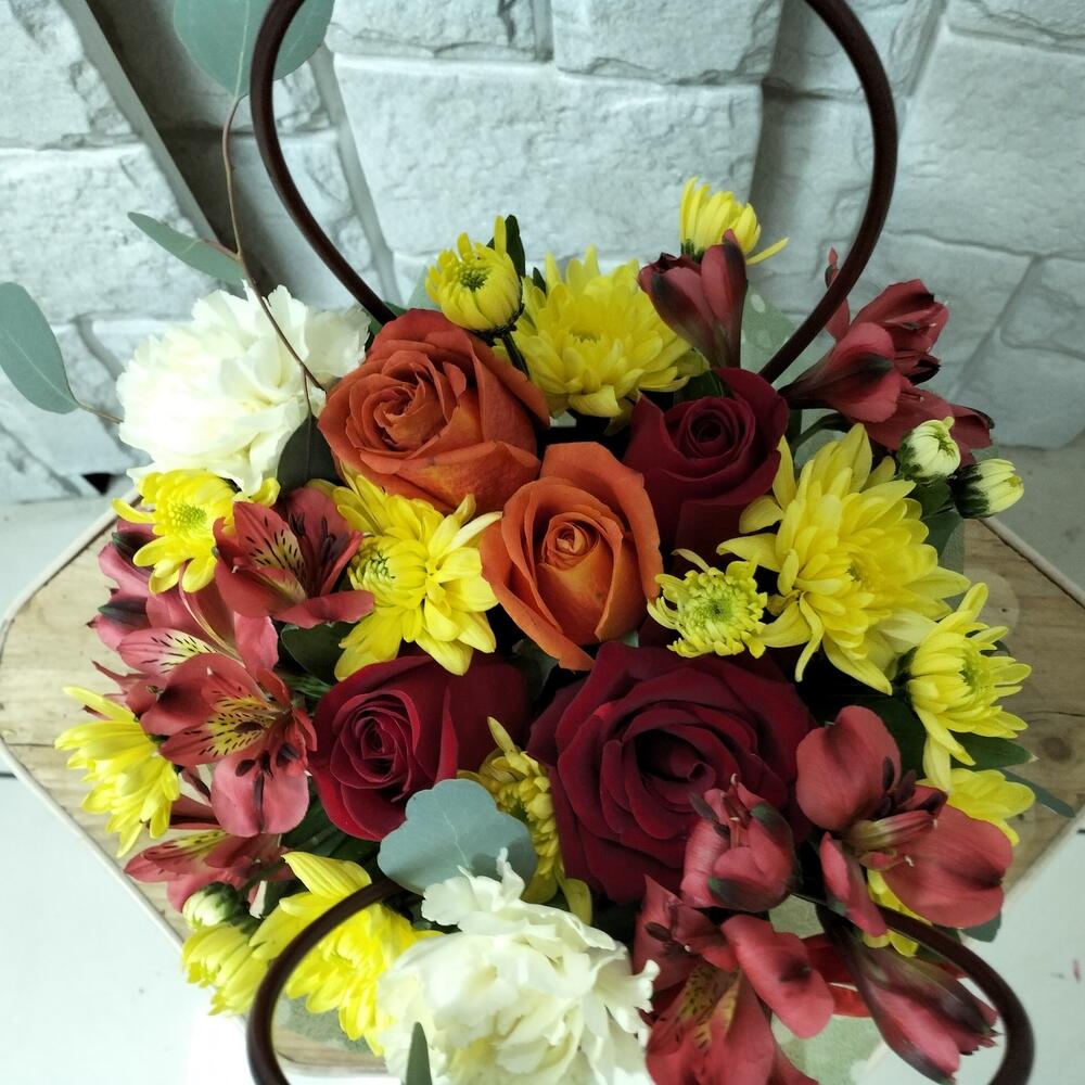 Роза Эквадор – 5 шт.Гвоздика сортовая – 2 шт.Альстромерия Микс Европа – 3 шт.Хризантема кустовая – 2 шт.Эвкалипт – 1 шт.Сумочка картонная – 1 шт.Лента атласная – 1 шт.