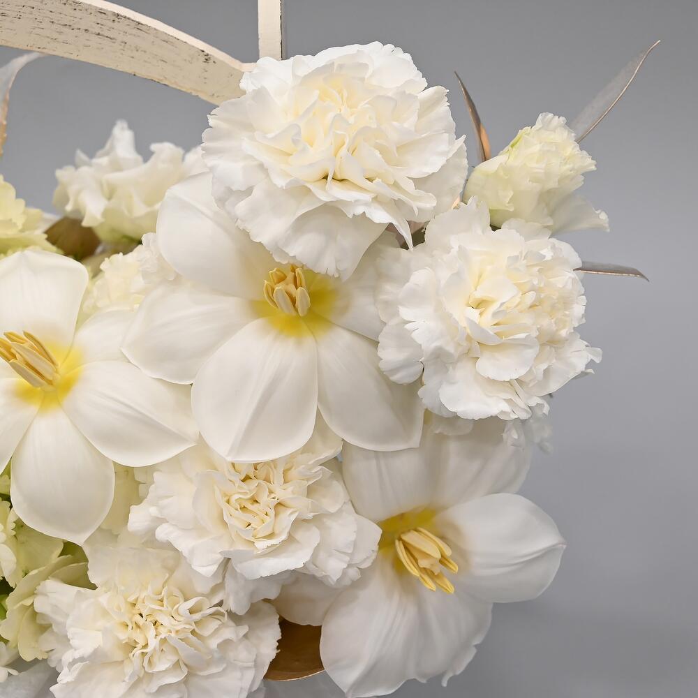 Французская роза – 3 шт.Эустома – 4 шт.Гвоздика – 7 шт.Тюльпан – 3 шт.Гортензия – 1 шт.Рускус – 5 шт.Аралия – 1 шт.Тишью – 2 шт.Ящик деревянный – 1 шт.