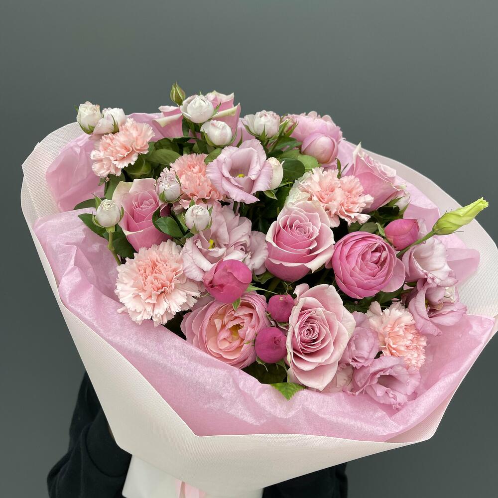 Гвоздики, Лизиантусы, Розы, Тюльпаны