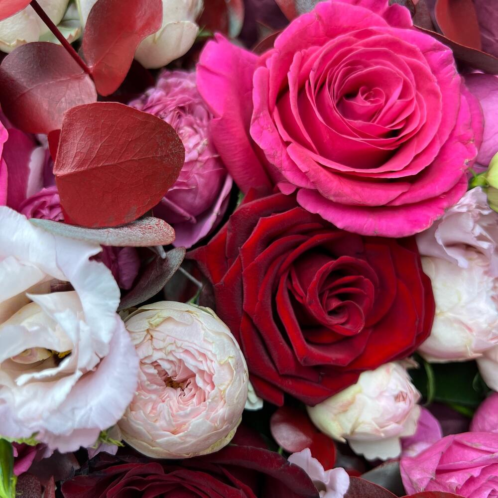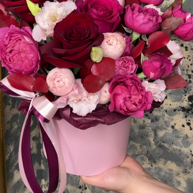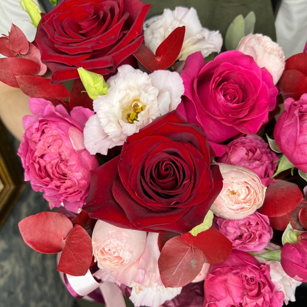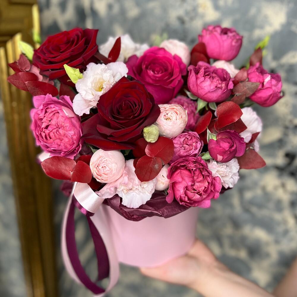 Роза Pink Floyd – 1 шт.Роза Эксплорер – 2 шт.роза пионовидная кустовая джульетта церайз – 1 шт.роза пионовидная кустовая мэнсфилд парк – 1 шт.эустома розовая – 1 шт.Эвкалипт – 2 шт.Оазис флористический – 1 шт.Коробка шляпная – 1 шт.Лента атласная – 2 шт.