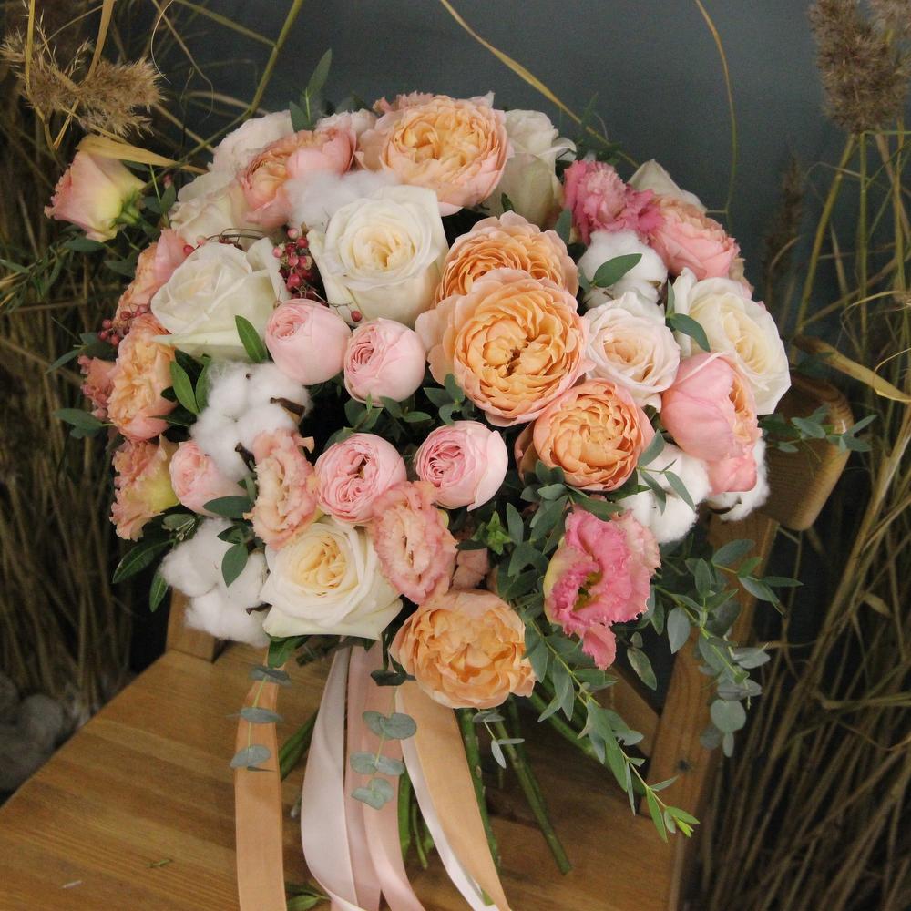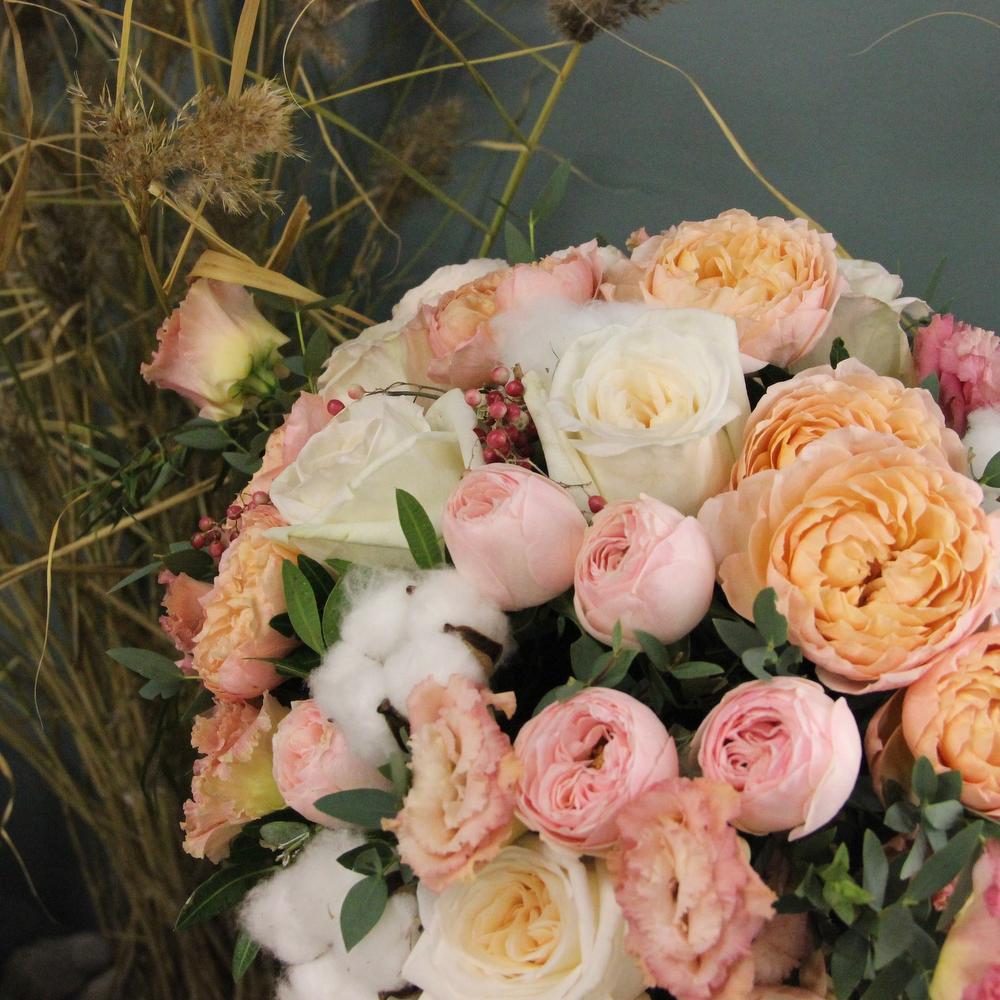 Роза пионовидная кустовая – 9 шт.Роза пионовидная – 7 шт.Лизиантус – 7 шт.хлопок коробка – 7 шт.Эвкалипт – 9 шт.Фисташка – 5 шт.Лента атласная – 2 шт.