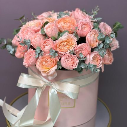 Необычная, шикарная коробка с бантом в черном цвете и шикарными розовыми розами. Создаст шарм и приятные впечатления для получателя.