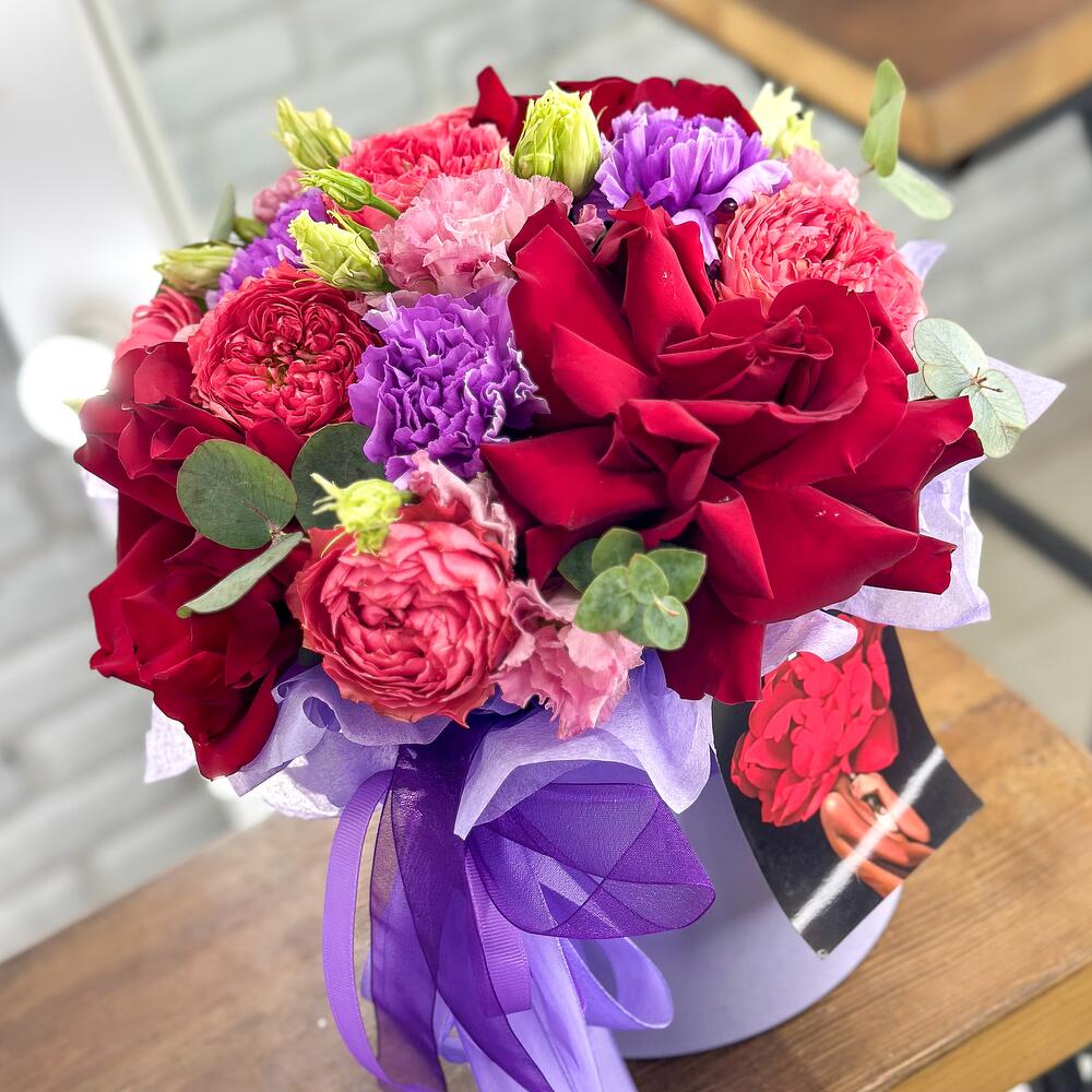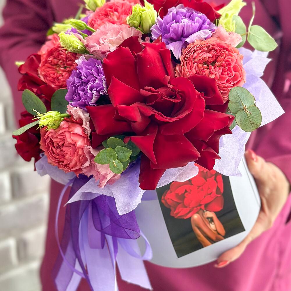 Необычная шляпная коробка с красными французскими розами,лизиантусом,садовой пион розой,с нотками эвкалипта приятно удивит получателя своим ароматом!Такая Роза одна из самых стойких вывернутых роз!Случайности не случайны!С букетом Вы получите конверт с открыткой,в которой мы напишем Ваше пожелание,инструкцию по уходу и средство для продления жизни цветов!Добавляйте товар и магазин в избранное,чтобы было легче нас найтиС уважением VaraBoro flowers