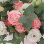 Роза кустовая – 7 шт.Лизиантус – 7 шт.Эвкалипт – 11 шт.Коробка шляпная – 1 шт.Оазис флористический – 1 шт.