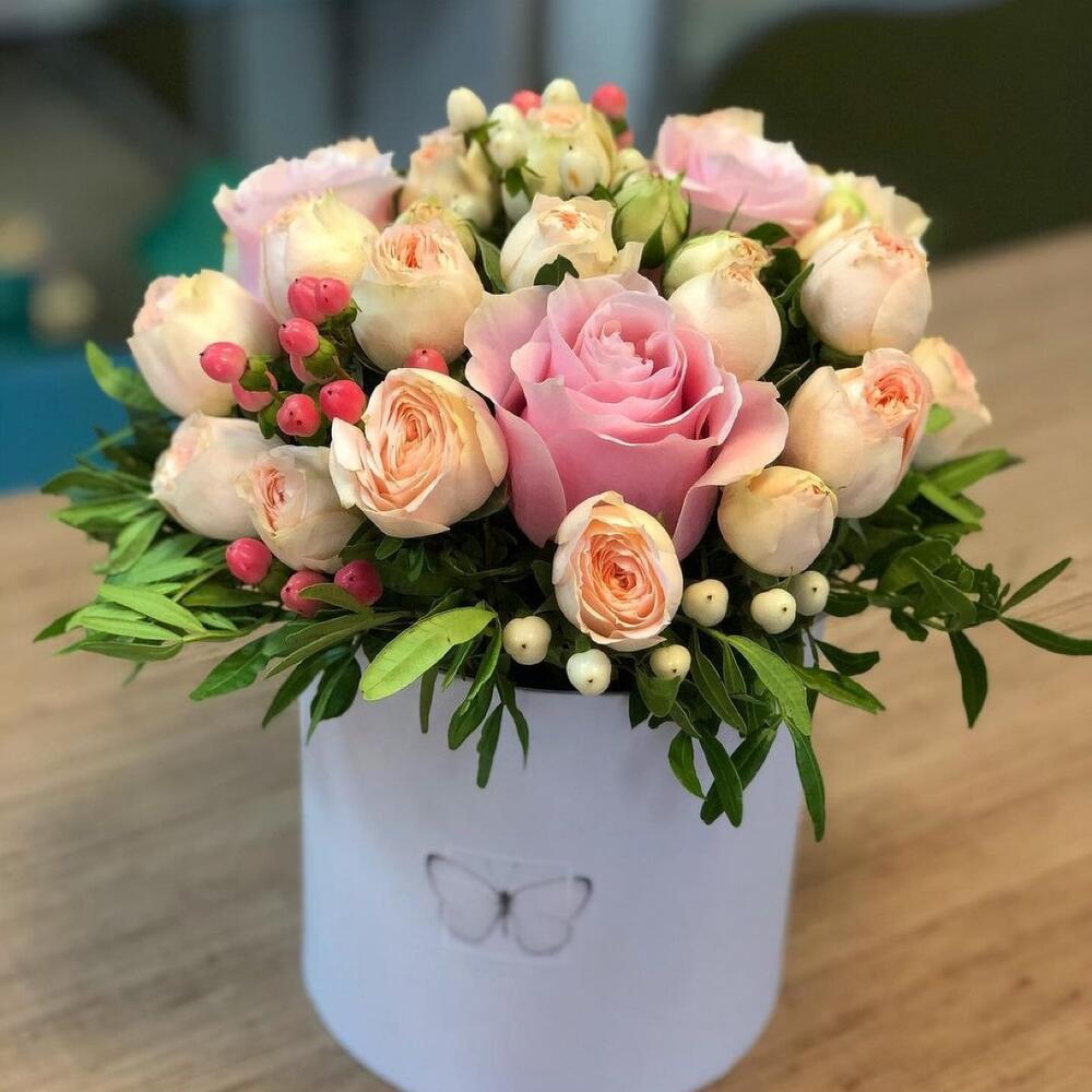 Гиперикум – 5 шт. Писташ – 1 шт. Роза – 3 шт. Кустовая роза – 4 шт. Шляпная коробка – 1 шт.