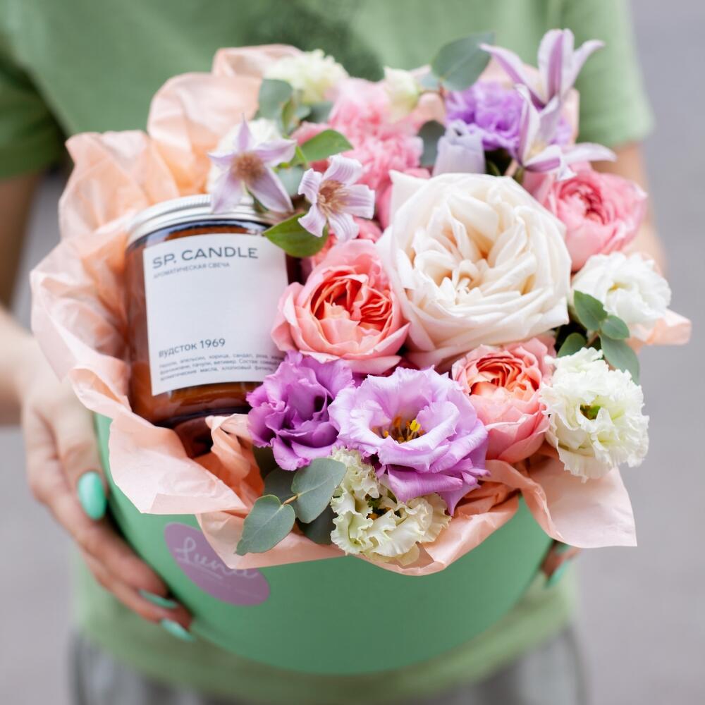 Цветы в коробке с аромасвечой SP CANDLES