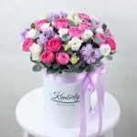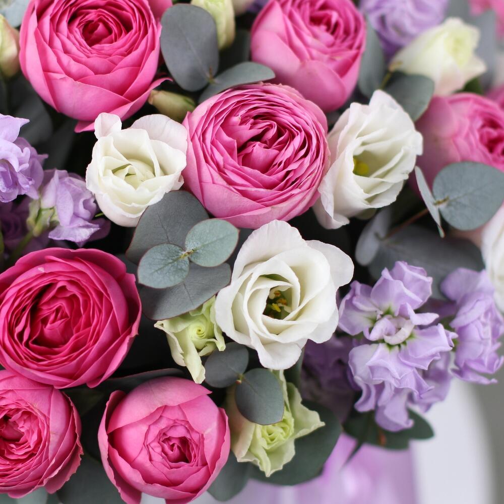 Пионовидная кустовая роза – 10 шт.Маттиола лавандовая – 10 шт.Эустома – 6 шт.Шляпная коробка – 1 шт.Губка флористическая – 1 шт.Атласная лента – 1 шт.Эвкалипт – 10 шт.