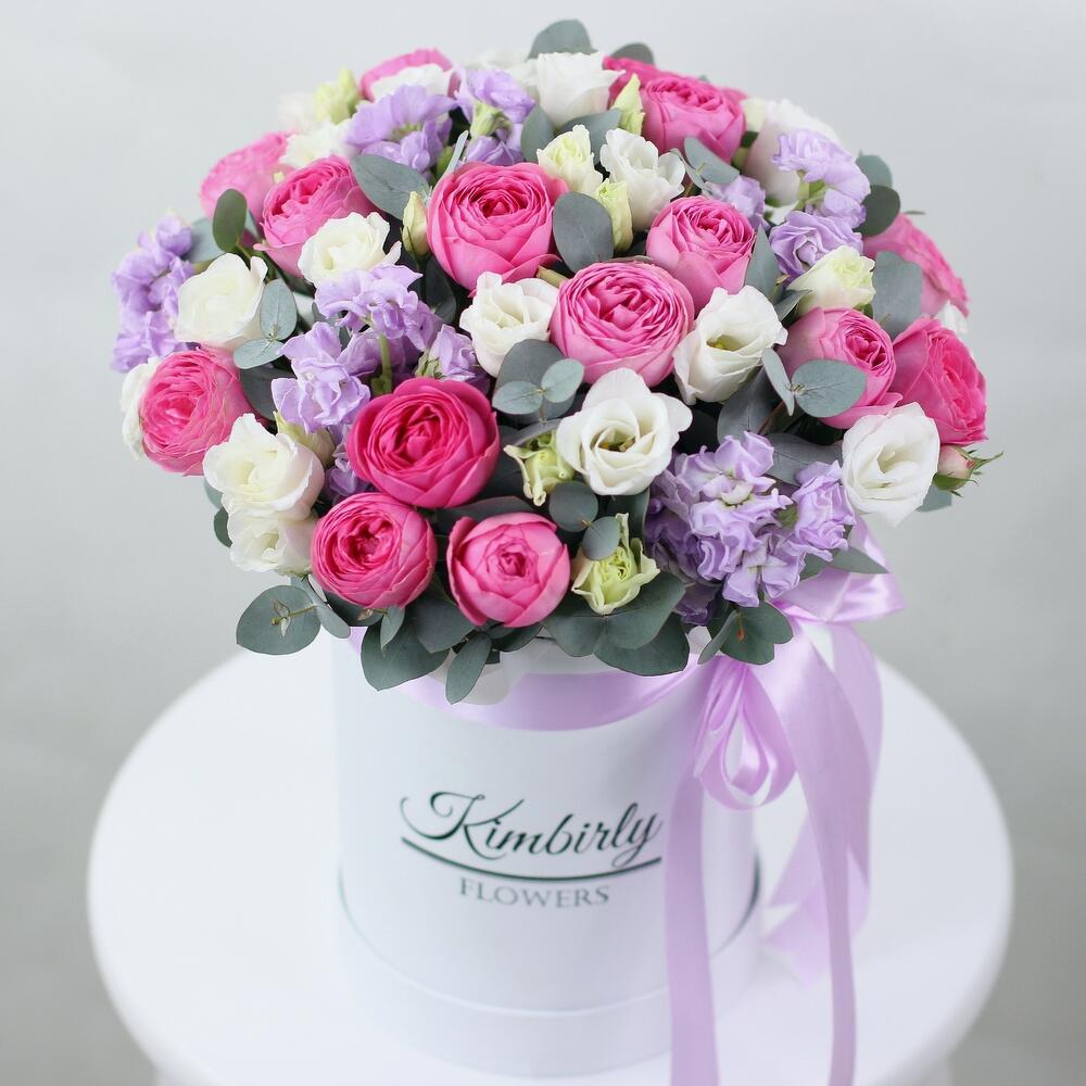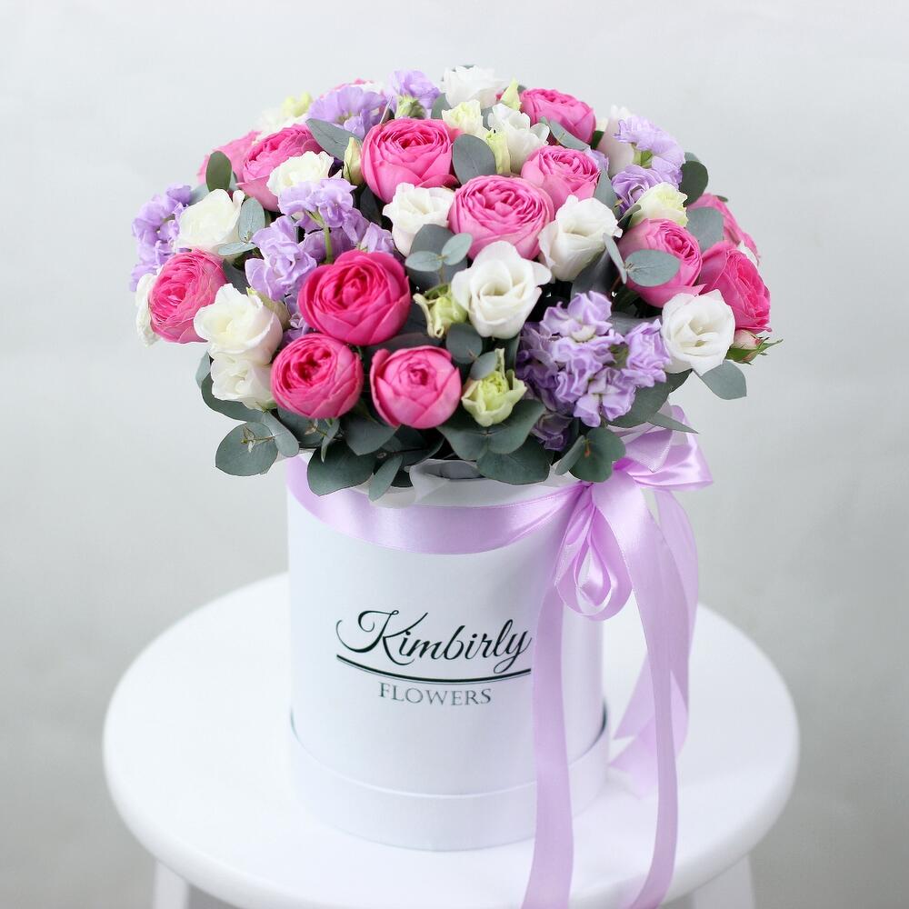 Цветы в шляпной коробке. Пионовидные кустовые розы Сильва пинк, эустома, маттиола. Букет 213 Kimbirly Flowers