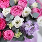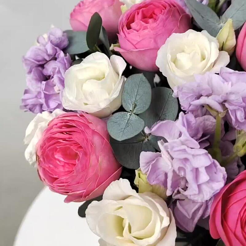 Ароматная маттиола, пионовидные кустовые розы, эустома и эвкалипт в стильной шляпной коробке. Композиция собрана на флористической губке, пропитанной водой. Такому подарку не нужна ваза, уход очень прост, нужно подливать воду в центр композиции, между цветами, раз в день, примерно 100мл воды