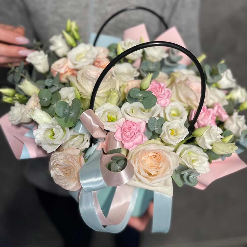 Пионовидная роза – 3 шт.Лизиантус – 3 шт.Кустовая роза Бомбастик – 2 шт.Диантус кустовой – 3 шт.Эвкалипт Baby Blue – 15 шт.Сумка – 1 шт.Оазис – 1 шт.