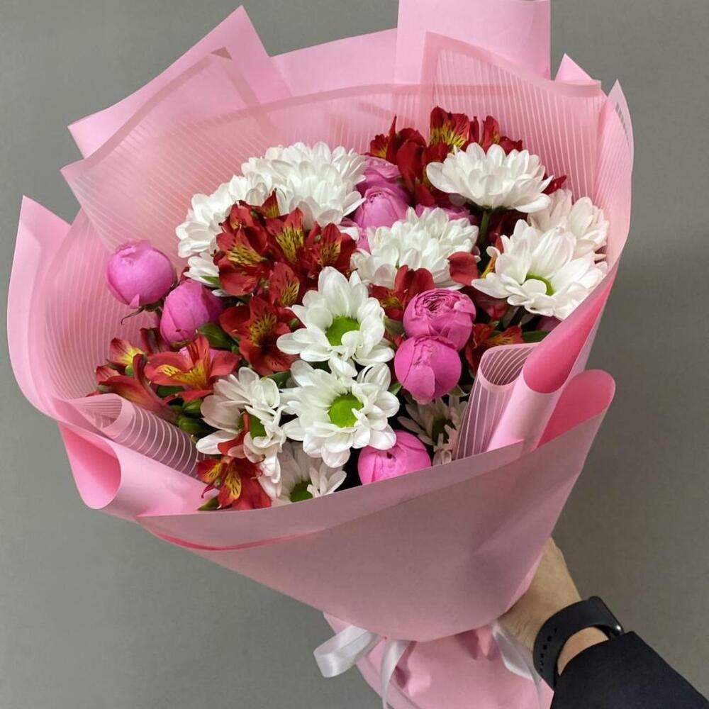 Альстромерии, Гвоздики, Кустовые розы, Лизиантусы, Розы, Хризантемы
