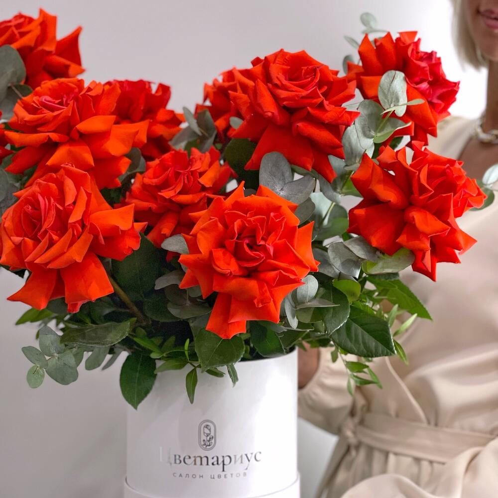 Французская роза – 11 шт.Эвкалипт – 3 шт.Фисташка – 3 шт.Шляпная коробка – 1 шт.