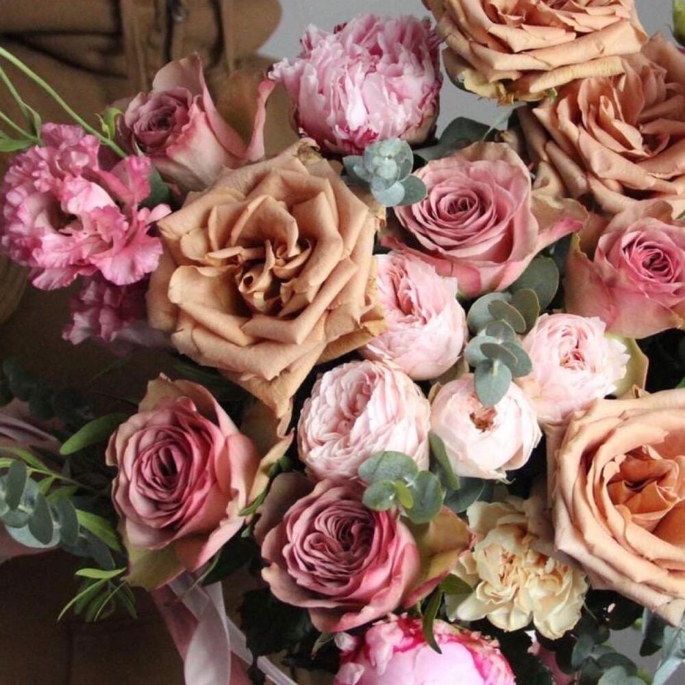 Пион – 4 шт.роза тоффи – 4 шт.Роза сортовая – 5 шт.Роза кустовая пионовидная – 2 шт.Лизиантус – 3 шт.Диантус – 3 шт.Эвкалипт – 7 шт.Лента – 1 шт.