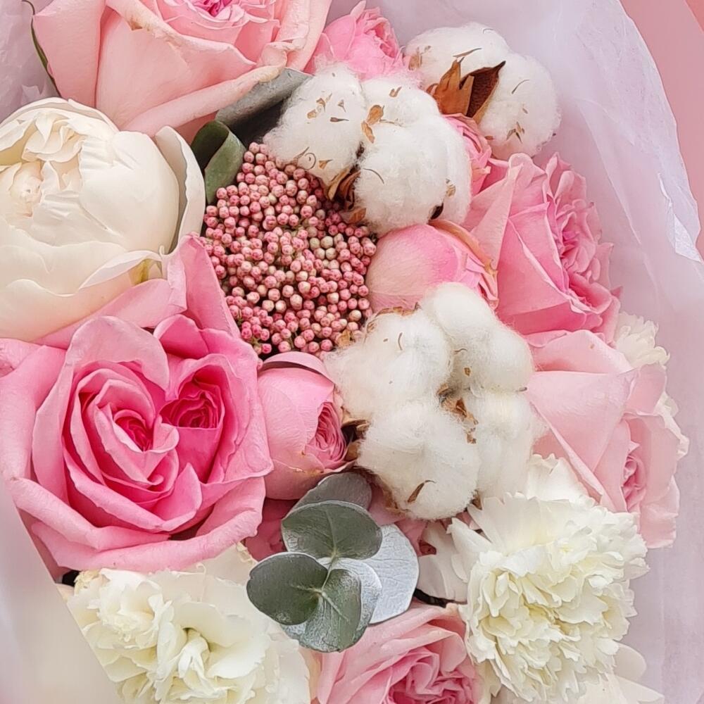 Озотамнус – 3 шт.Эвкалипт – 2 шт.Пион белый – 2 шт.эустома махровая – 3 шт.Хлопок натуральный – 3 шт.Диантус сортовой – 3 шт.pink o’hara роза – 5 шт.mansfield park – 2 шт.