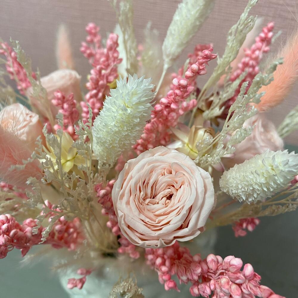 Лимониум – 1 шт.Роза стабилизированная – 5 шт.Лагурус – 5 шт.Кашпо керамическое – 1 шт.Фаларис – 5 шт.Оазис флористический – 1 шт.пампасная трава – 1 шт.гелихризум (сухоцвет) – 5 шт.сорго африканский – 1 шт.