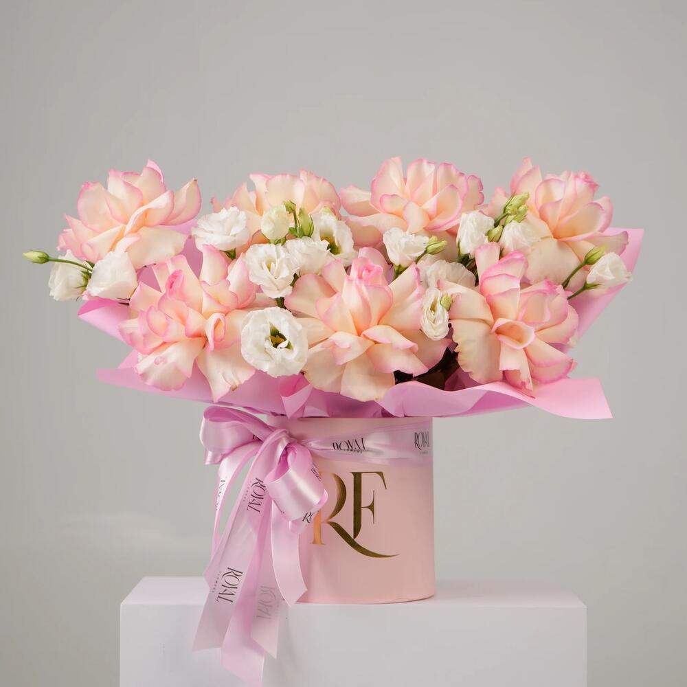 Цветочная композиция в шляпной коробке с пионовидными розами