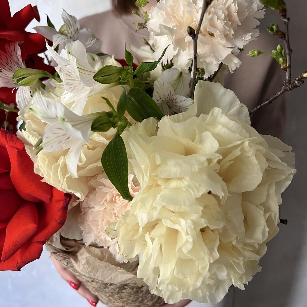 Альстромерия – 2 шт.Пион – 2 шт.Роза – 4 шт.Гвоздика – 3 шт.Оазис – 1 шт.Ветка – 1 шт.кашпо джутовое – 1 шт.