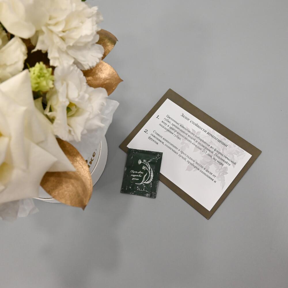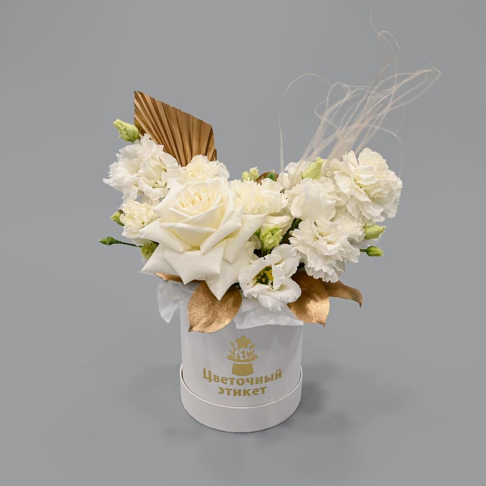 роза пионовидная playa blanca – 1 шт.Гвоздика – 2 шт.Гвоздика кустовая – 2 шт.Эустома – 1 шт.Рускус – 2 шт.Лист пальмы – 1 шт.Ковыль – 1 шт.Шляпная коробка – 1 шт.