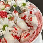 Пиафлор (оазис) – 1 шт.Роза кустовая – 2 шт.Хризантема кустовая – 1 шт.Раффаэлло – 8 шт.Коробка – 1 шт.Упаковка дизайнерская – 2 шт.зелень декоративная – 1 шт.