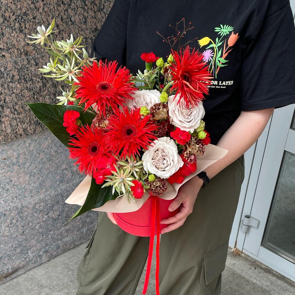 левкадендрон – 1 шт.Эустома – 2 шт.Гербера – 5 шт.Коробка шляпная – 1 шт.Роза пионовидная – 3 шт.Диантус кустовой – 5 шт.Оазис флористический – 1 шт.талин – 1 шт.