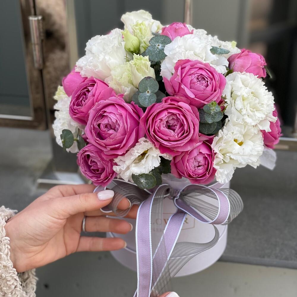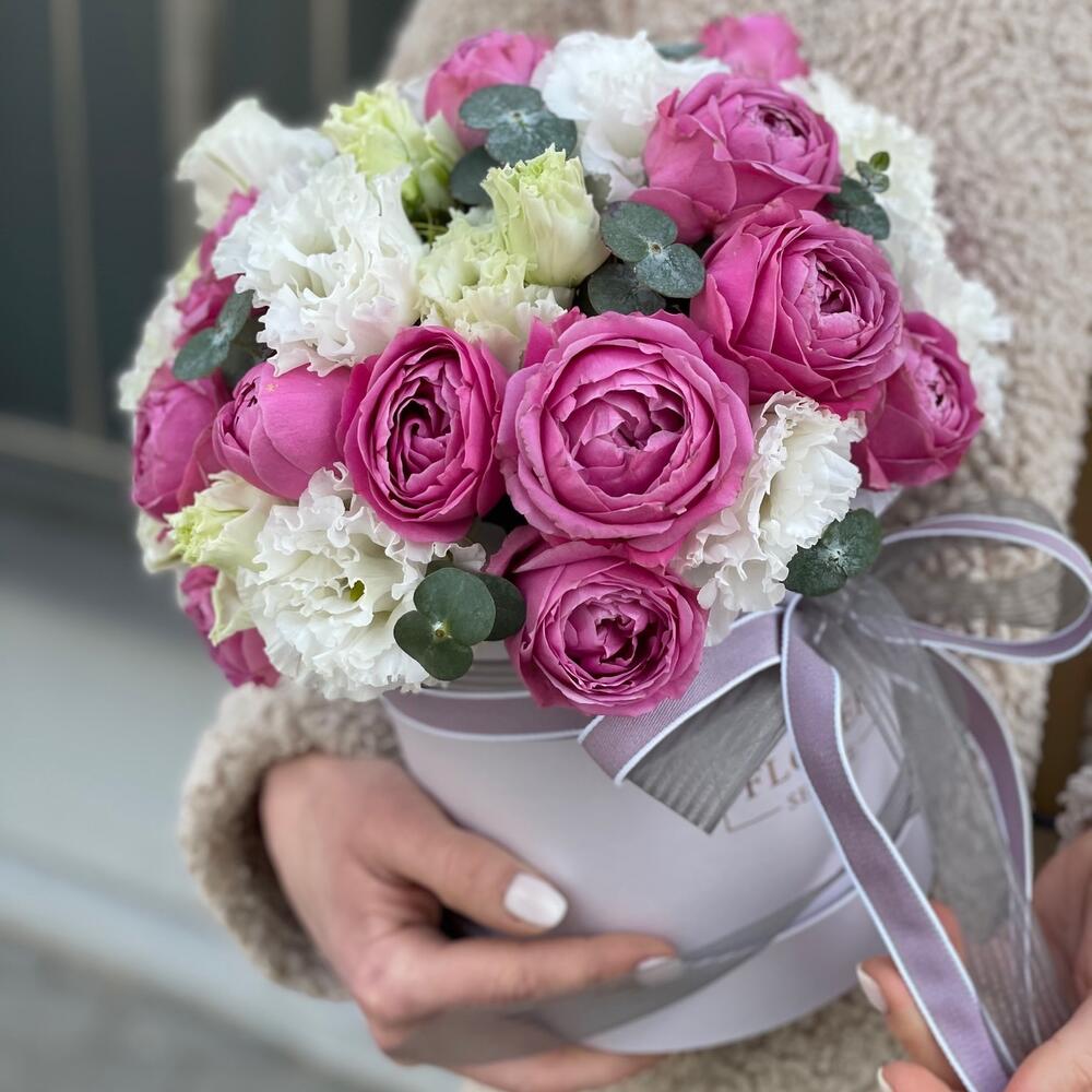 Коробка из пионовидной розы Misty Bables и эустомы!