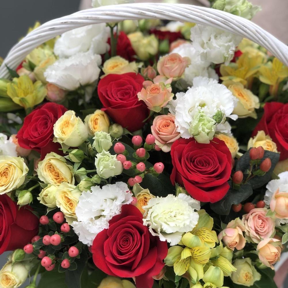 Эустома – 5 шт. Салал – 6 шт. роза красная фридом – 15 шт. Оазис – 3 шт. кустовая роза бандолеро – 5 шт. кустовая роза азора – 8 шт. Гиперикум – 5 шт. Альстромерия – 6 шт. Корзина – 1 шт. Оформление – 1 шт.