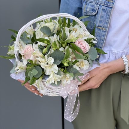 Корзина Моя Нежная с розовыми розами и альстромерией