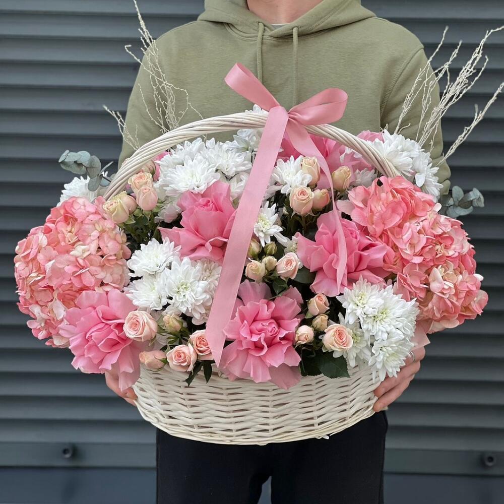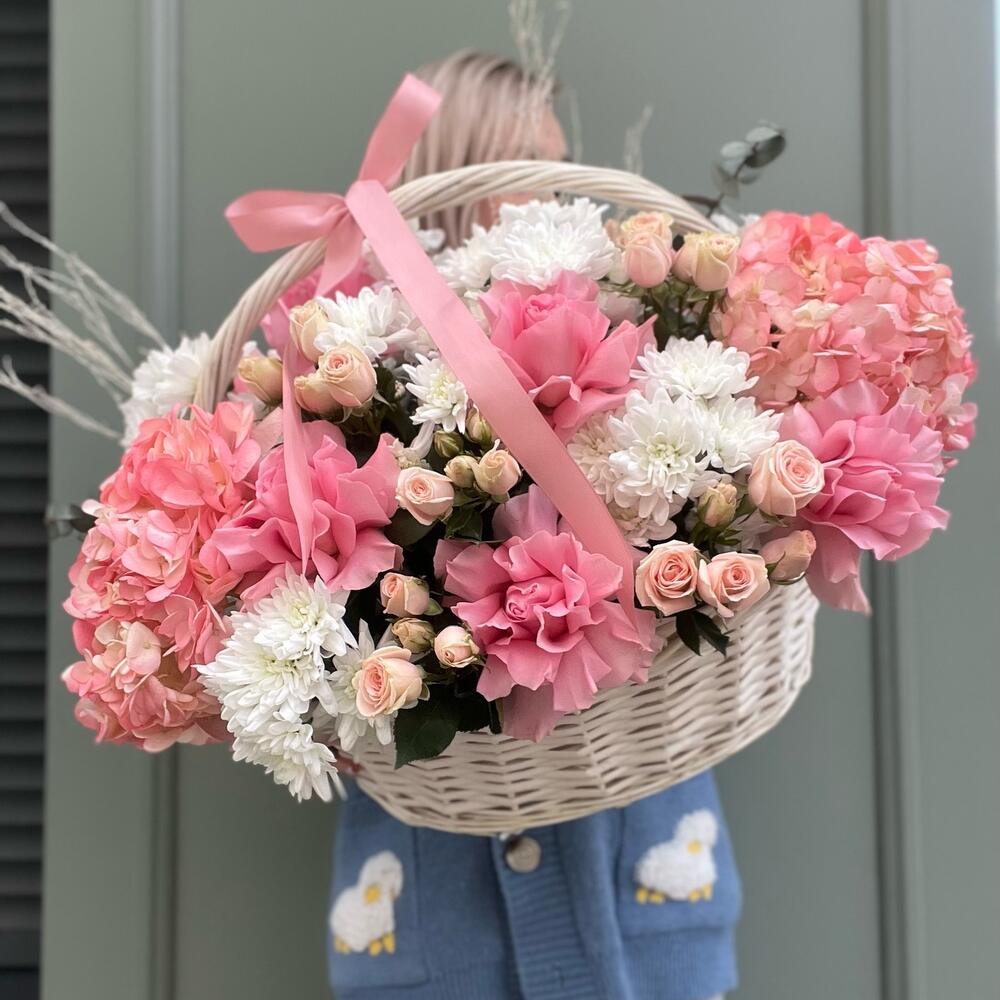 Альстромерии, Гортензии, Кустовые розы, Лизиантусы, Розы, Хризантемы