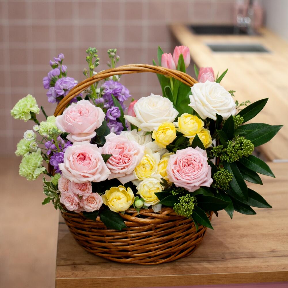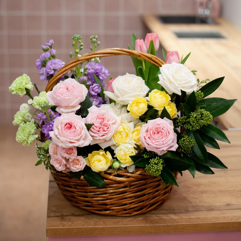 Пионовидная роза – 6 шт.Пионовидная кустовая роза – 3 шт.Диантус – 5 шт.Скиммия – 5 шт.Тюльпан – 6 шт.Маттиола – 4 шт.Хризантема кустовая – 3 шт.Зелень – 6 шт.Корзина плетеная – 1 шт.