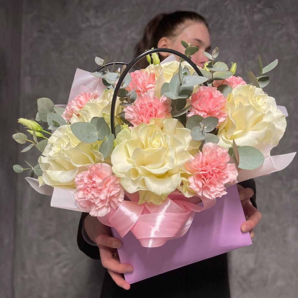 Лента – 2 шт.Эвкалипт – 7 шт.Диантус – 7 шт.Роза Мондиаль – 5 шт.Сумка – 1 шт.Оазис флористический – 1 шт.