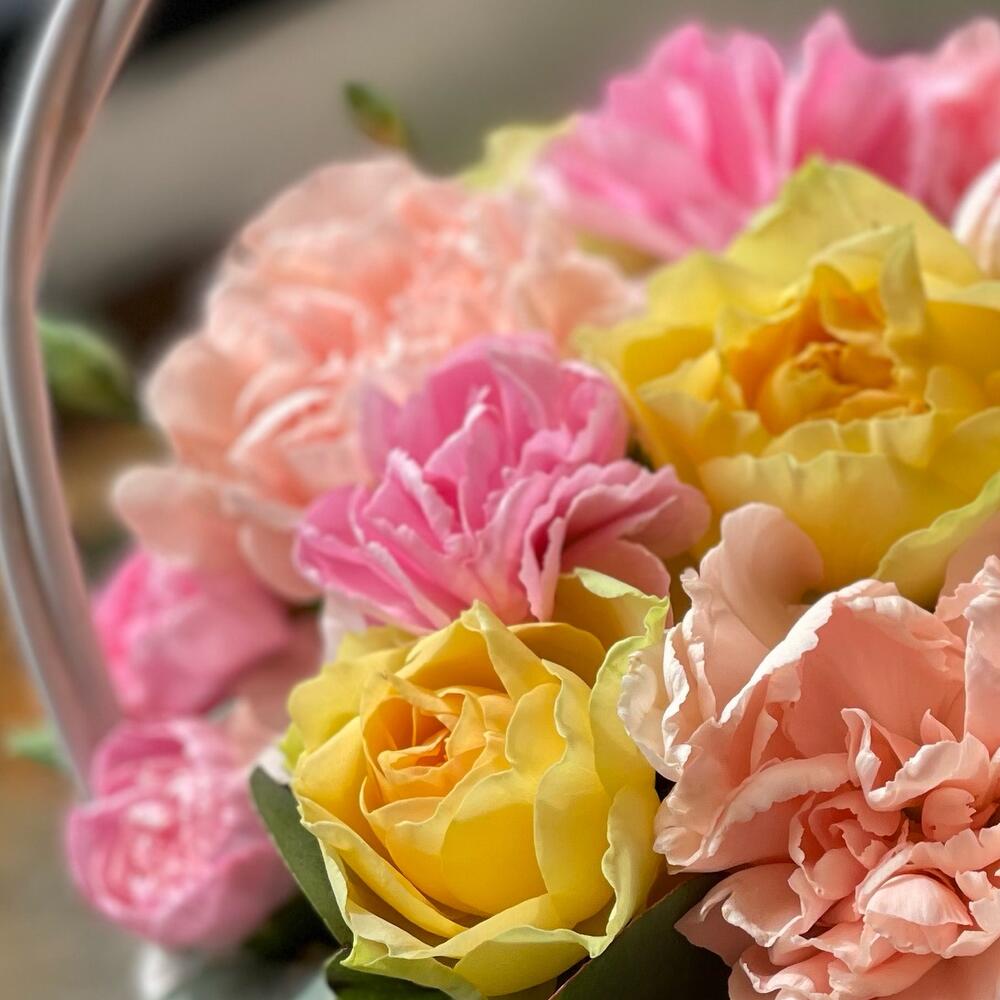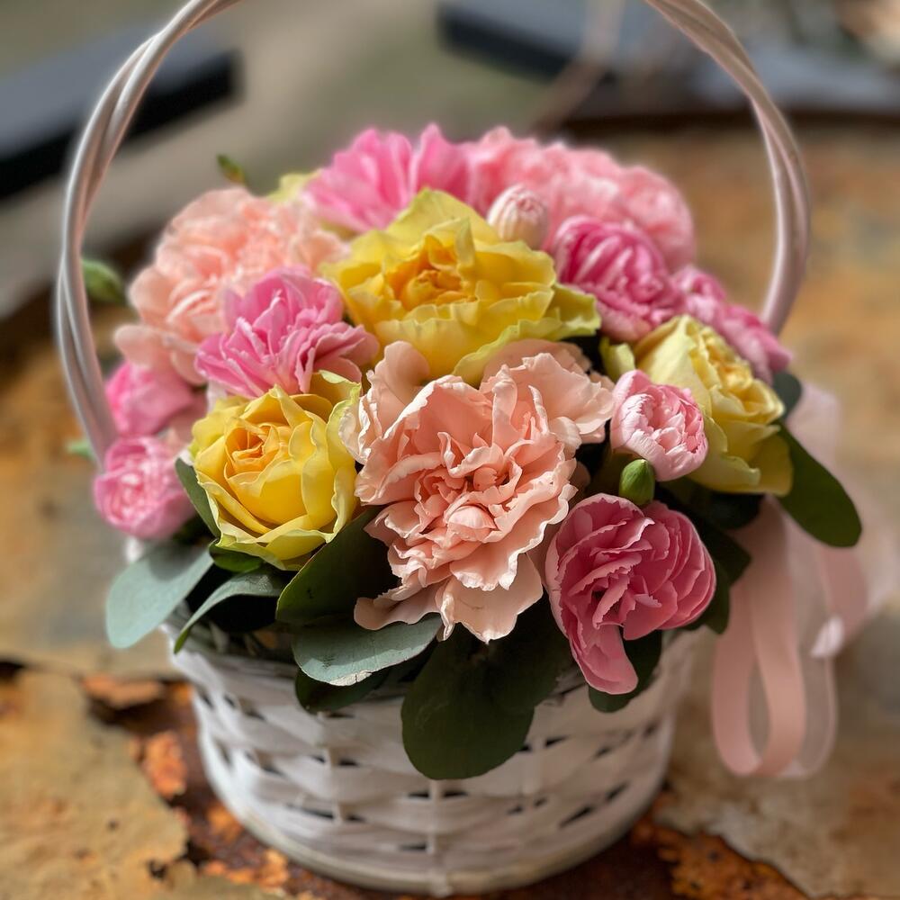 Гвоздика – 3 шт. Гвоздика кустовая – 3 шт. Роза кустовая – 3 шт. Зелень – 1 шт. Корзина плетеная – 1 шт.