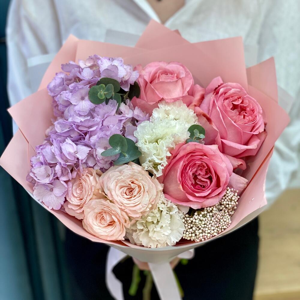 Гортензия – 1 шт.Озотамнус – 1 шт.Кустовая пионовидная роза – 1 шт.Пленка матовая – 2 шт.эустома белая – 1 шт.роза пинк экспрешн – 3 шт.эвкалипт 50 – 3 шт.