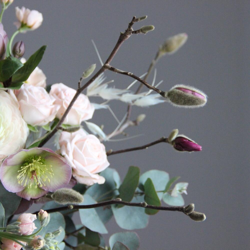 магнолия ветки – 2 шт.Ранункулюс – 3 шт.Амми – 3 шт.Маттиола – 3 шт.Хелеборус – 2 шт.Хризантема момоко – 2 шт.авена – 3 шт.Сантини – 2 шт.Эвкалипт – 5 шт.Роза кустовая пионовидная – 2 шт.Лента атласная – 1 шт.