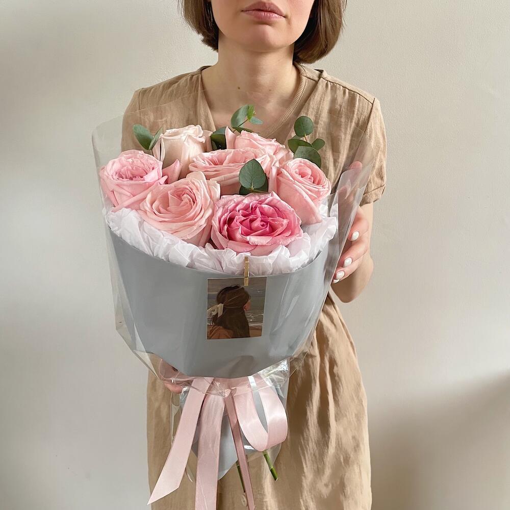 Эвкалипт – 3 шт.Упаковка дизайнерская – 1 шт.роза пинк охара(ароматная) – 7 шт.