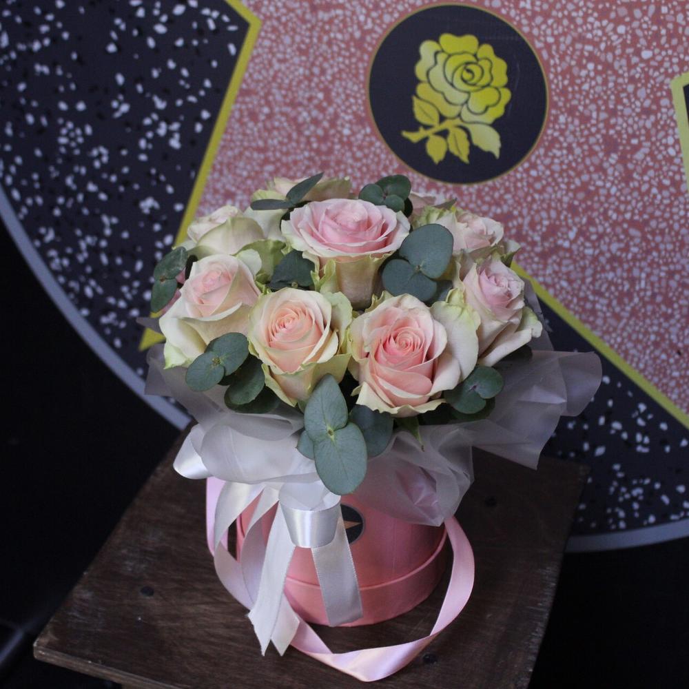 роза фруттето – 9 шт.Эвкалипт – 3 шт.Пленка дизайнерская – 1 шт.Оазис флористический – 1 шт.Шляпная коробка – 1 шт.Лента атласная – 1 шт.